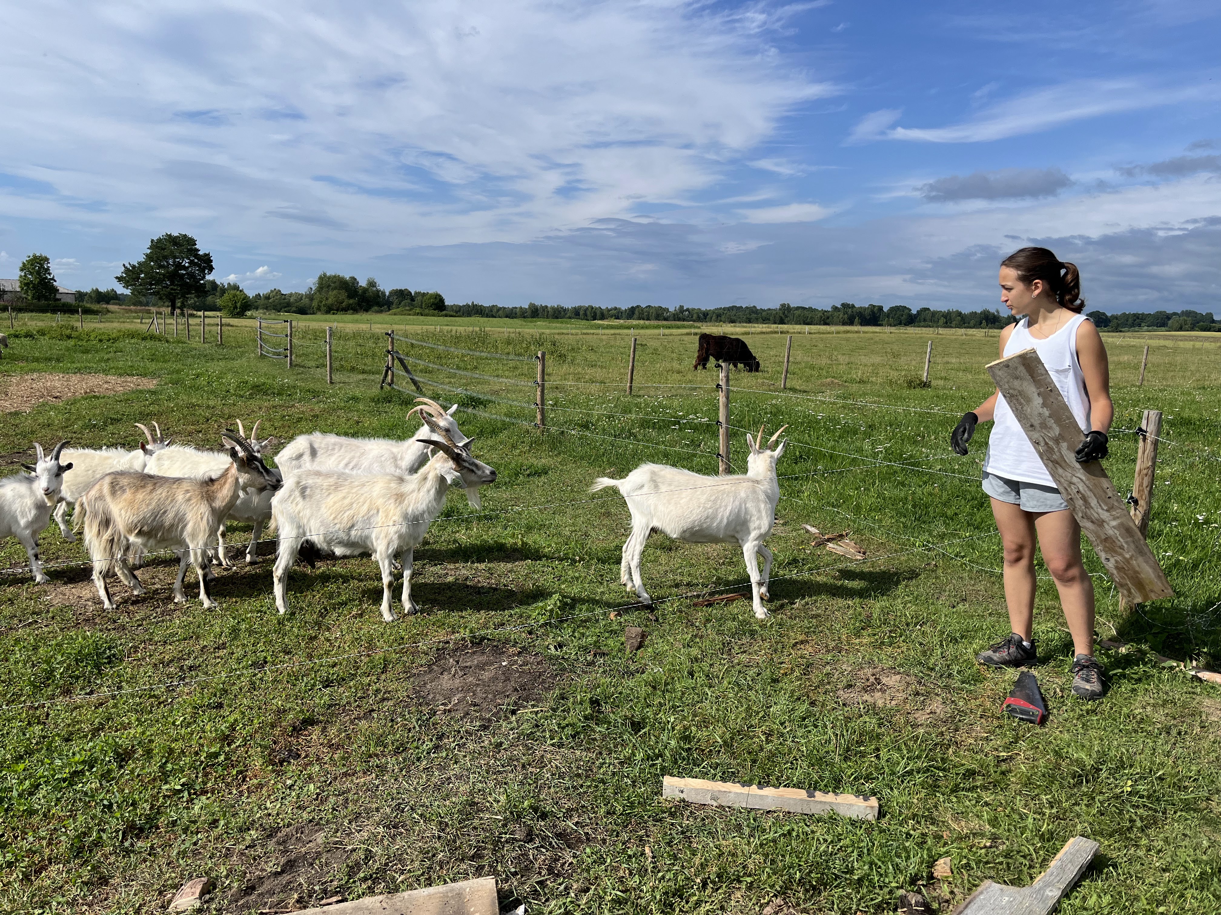 Participants may assist in caring for farm animals such as sheep, goats, and other animals. Tasks can include building and repairing pasture paddocks, cleaning spaces, and preparing food supplies for the winter season.