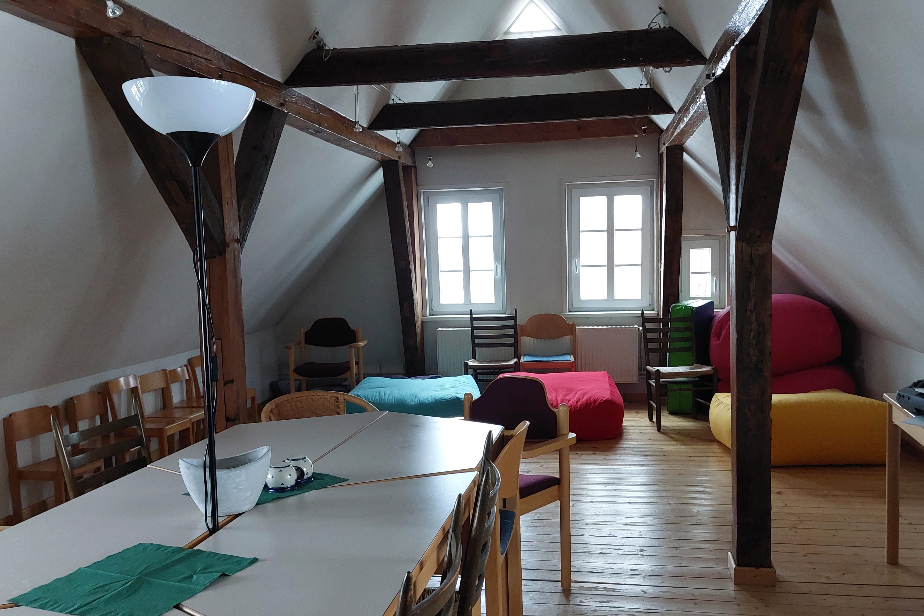 In the parish hall of the Andreasgemeinde in Springe: a bedroom with air beds will be set up for you on the upper floor of the former parish widow's house. The kitchen and a dining and common room are located in the parish hall directly opposite. Wi-Fi and a washing machine are available in the house. Shower facilities are available at the swimming pool, which you can reach in 6 minutes by bicycle. Your place of work in the bison enclosure can be reached by bicycle in just 16 minutes (5.2 km).