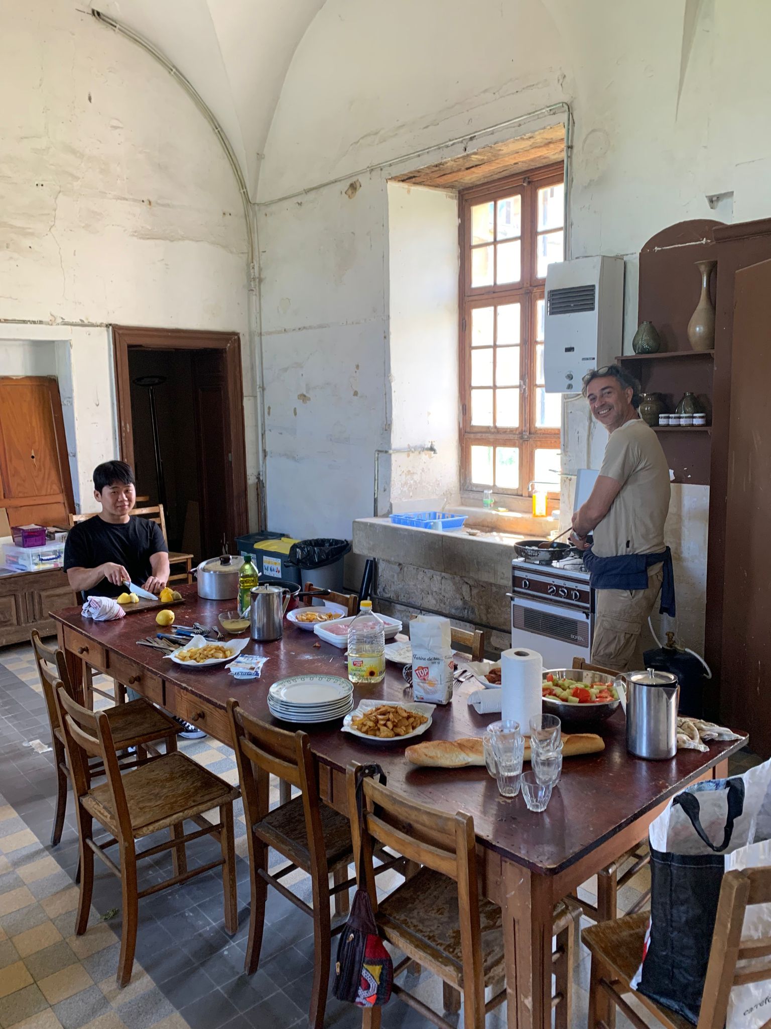 Hébergement insolite ! Les bénévoles dorment dans les anciennes chambres des sœurs du Couvent. Ils·elles occupent une aile du bâtiment composée d'une cuisine, d'un espace de vie et de sanitaires, et sont voisins directs avec des propriétaires au petit soin. L'ambiance du chantier se veut donc très familiale.